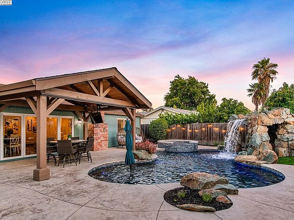 Single-Story Oasis with Luxury Pool & spectacular entertainer’s backyard! Dream home in the heart of Livermore! This beautifully updated single-story gem offers the perfect blend style, and outdoor luxury! Featuring Owned Solar, this energy-efficient invites you in! Bright, open-concept living space ideal for both everyday living and entertaining. The modern kitchen is a chef’s delight with crisp white cabinetry, stainless steel appliances, and a cozy dinette area, all seamlessly flowing into the spacious main room. CAFE appliances including double dishwasher!! Absolutely gorgeous 4-pane glass door frames that fully slide to open your private backyard paradise. Full wall to floor screen keeps the natural light coming in and allows airflow throughout the home! Step outside to a true resort-style retreat, complete with a sparkling in-ground heated pool featuring a waterfall, swim-up grotto, covered grotto & seating area with separate elevated spa. Entertain guests under your custom pergola with a mounted TV, built-in heater, & stamped concrete patio perfect for al fresco dining. Inside each room has a ceiling fan for year-round comfort. Side Yard Access, providing space for storage, a small RV, or recreational toys. 2 car garage with 220 volt EV Outlet. This move-in ready home