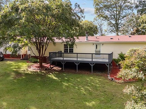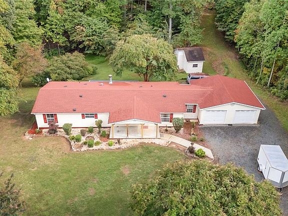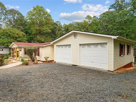 $5000 buyer incentive toward flooring or closing cost. This 3 bedroom 2 full bathroom home is within walking distance of Mountain View Shopping Center and several restaurants! Just outside of the City Limits of King, NC. Beautiful setting with covered front porch, double garage with storage area. Full-size rear deck, outbuilding behind the house for additional storage or lawnmower. Perfect floor plan with a primary bedroom with en-suite and walk-in closet on one side of the house and the other 2 bedrooms just off the kitchen area. Huge living room with wood-burning fireplace or set up gas logs. Large kitchen with plenty of countertop space and additional island for counter-height seating. Close to Hanging Rock & Pilot Mountain State Parks for hiking and climbing. The City of King, NC has 3 shopping areas, a revitalized downtown, and 2 medical facilities for family and Specialist Doctors