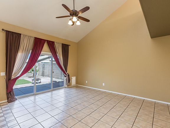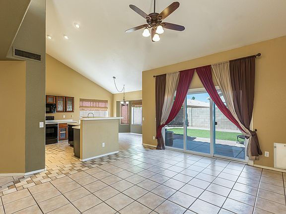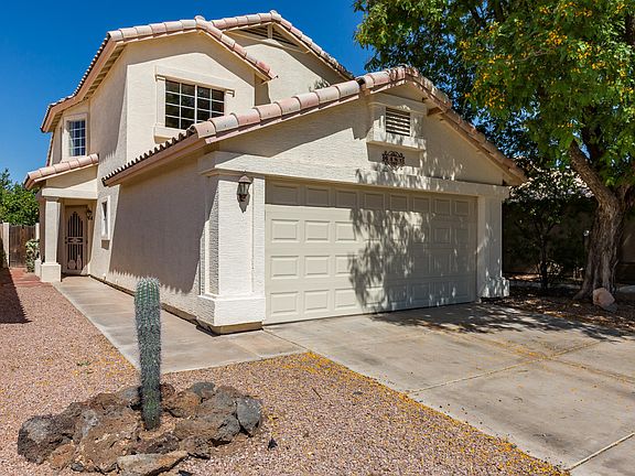 This move-in ready home offers 3 bedrooms & 2.5 baths in 1846 SqFt with a great room floor plan & upstairs loft. The kitchen has oak cabinetry with glass fronts, black/white appliances, lots of counter space, dual-height island with breakfast bar, pantry & dining nook with bay window. Sliding doors lead out from the great room to the extended paver patio & low maintenance backyard with artificial turf, citrus tree & desert landscaping. The master bedroom is on the main level & has double door entry, tile floors & private bath with dual sink vanity, separate tub & shower & walk-in closet. 2 secondary bedrooms & full bath are upstairs. Other features: 2 car garage with shelving, newer A/C unit & refrigerator, washer, dryer included! See today!