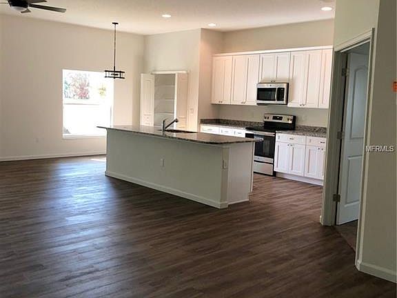 - Interior Features: High Ceiling(s), Walk-In Closet(s), Open Floorplan, Solid Surface Counters, Solid Wood Cabinets, Kitchen/Family Room Combo, Thermostat