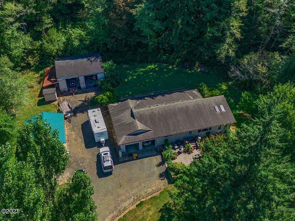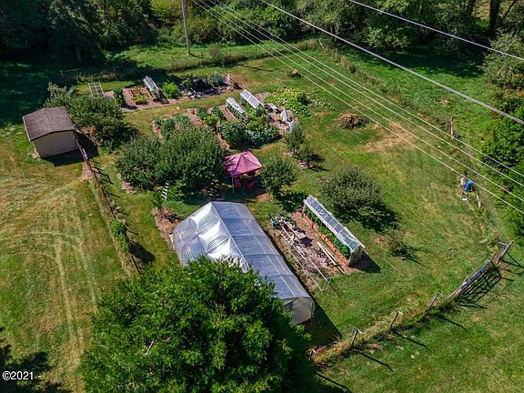 At the end of a private drive is a gardeners dream! 4.92 acres secluded but is not isolated with a meandering creek. There is a large, fenced garden area with multiple raised beds, many of them covered, and a Green House with more raised beds and a lemon, tangerine tree and grapes growing. There are 3 apple trees, a plum, peach and pear tree and mature blueberry and loganberry. The pole barn is big enough for RV, tractors, riding mowers, and toys. The additional garage and shop is a great space for any hobby and there's another shed that has been a chicken coupe. The single level living home has two bedrooms, two baths which has been remodeled with new carpeting, flooring, updated bathrooms, and kitchen. The solarium/sunroom is delightful and