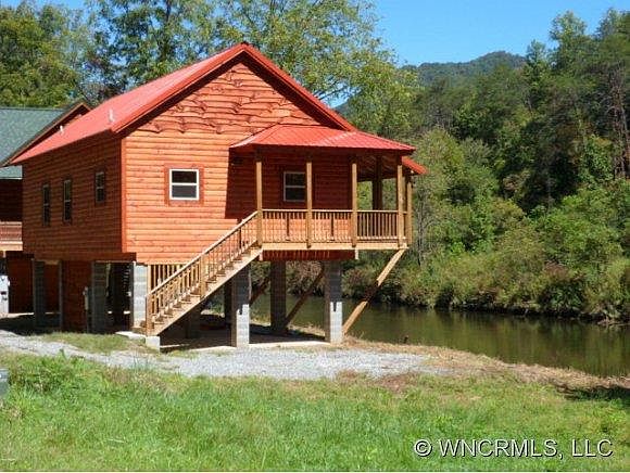 Tuckasegee River frontage in River Bend Landing. New log sided 2BR/2Ba plus large loft, 9' ceilings in bedrooms w/25' cathedral ceilings in open great room. Hickory cabinets, laminated hardwood, SS appliances, covered porch that overlooks the Tuck. House on stilts w/parking under house w/room for storage. River Bend Landing is small riverfront development only a couple miles from WCU. Would be a great vacation rental fish or swim from your yard!