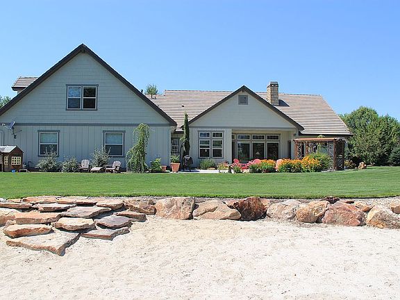 WATER VIEWS in front and back! Newer, mostly single level, home located in small upscale neighborhood bordering the Boise river. Open floor plan with abundant natural light, designer touches and upgrades throughout. Tile roof, dual HVAC systems and massive 1736 sf garage. East facing back yard features a sandy beach with fire pit, boat dock and expansive water and mountain views! Room to build a shop or RV garage. Community boasts 52 acres and 6 large stocked ponds for the resident's enjoyment.