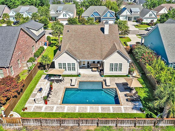 This meticulously maintained 4 bedroom 3 full bath custom home tucked in the desirable Tanbridge Park community is just minutes from Wrightsville Beach! Lush coastal landscaping, an extended driveway, and a rocking chair front porch greet you upon entering. Inside, enjoy an open/split bedroom floorplan featuring 10-foot ceilings, hardwood floors, custom-built in storage, plantation shutters throughout, and tons of light and space. Cuddle up in front of the gas log fireplace in the living area, or step outside through the extra tall French doors leading to the resort style amenities. The gorgeous 14 x 28-foot Shotcrete inground saltwater pool with a 7 x 14-foot sun shelf, and the built in grilling station/outdoor kitchen come complete with seating. This home backs up to a 49-acre protected nature area making the private backyard oasis unique beyond compare. Returning inside, you will find a chef's kitchen outfitted with a gas range with hood vent, a pantry, granite countertops and subway tile backsplash, stainless-steel smart appliances, and a kitchen island with built-in microwave, additional storage, and bar seating. The main level primary suite boasts a generous walk-in closet with custom shelving, and a double basin vanity, tile walk in shower and soaking tub in the bath. Two additional bedrooms, one with its own full bath, and a laundry room with cleaning sink round out the first floor. Upstairs the 18.9x13.9 4th bedroom could also serve nicely as a home office or media room. The HOA dues cover front yard and fence maintenance, and natural gas is available from the street. Area beaches are right down the road and there is easy access to The Forum, Mayfaire and Autumn Hall shopping and dining...soon to be joined by Center Point and The Avenue to make this the most desirable shopping and dining area in all of Wilmington!