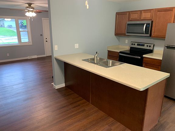 Beautiful 3 bedroom, 1 bathroom ranch style home with attached garage located in southwest Davenport conveniently located by schools, shopping, grocery stores, parks, etc. An entire remodel of the main level was completed one year ago! This place is ready for someone to call home. Too many improvements to list some include: New fence around back yard, new flooring throughout (vinyl plank and carpet) new fully furnished kitchen (stainless/black appliances), new bathroom, all new doors and trim throughout, new paint and fixtures, large closets, completely new sewer and plumbing and much more.. Laundry hook-up present, tenant supplies washer and drier. Private, fenced in back yard with a creek to listen to, fire pit and deck for entertaining. Tenant is responsible for all utilities. Pets are considered on a case by case basis and require a separate, non-refundable $300 pet deposit in addition to one month's rent security deposit. Tenant is responsible for lawn care and snow removal. Smoking is not allowed inside the home. $40 online application process.