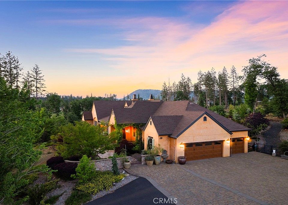 Rare find property that's simply put, Better Than New! A property of this stature would cost you millions to rebuilt and its tucked away in a peaceful, private setting just minutes from town, in one of the only gated neighborhoods in Paradise. This exquisite French Country estate blends refined craftsmanship with thoughtful design. Approximately 3.08 Acres of land, boasts 3 bedrooms, 4 bathrooms, and an office, this home offers a spacious and highly functional floor plan. From the moment you enter, you will notice the soaring vaulted ceilings, richly detailed wood-beams, custom built-ins, & a wood-burning fireplace with a cast-concrete hearth. Australian walnut flooring throughout, creating a seamless connection to the gourmet chef’s kitchen, complete with soapstone countertops, knotty alder cabinetry, a Wolf cooktop, Dacor double ovens and hood, Sub-Zero-style refrigerator, a brand new KitchenAid dishwasher, large prep island with bar seating and second sink, and a walk-in pantry. The primary suite is a real retreat, featuring a spa-like en-suite bathroom and a walk-in closet. Two additional guest bedrooms are tucked into a separate wing of the home, each with their own walk-in closets & shared Jack & Jill bathroom. Recently updated with freshly painted cabinetry and interior spaces, the home also includes a host of upscale amenities such as central vacuum, a whole-house stereo system, whole-house fan, water filtration system, radiant wall-mounted heating panels, custom drapery and window coverings, elegant fixtures, and wood casement windows. The attached three-car garage includes a storage room and is complemented by wood-look garage doors, a paver stone driveway, and a gated entrance. The property is equipped with 30 and 50 Amp RV hookups & a generator-ready setup with transfer switch. Outdoor living is just as impressive, featuring a slate tile patio beneath a pergola with a wood-burning fireplace and calming fountain—ideal for alfresco dining or gatherings with friends. A second patio at the front of the home provides sweeping territorial views, a powered sunshade, & another elegant fountain. The grounds are a lush sanctuary filled with blooming gardens, vibrant landscaping, & many mature trees including oaks, pines, Japanese maples, apple, pear, plum, fig, cherry, apricot, lemon, & lime. Stone paths lead to a secluded pergola-covered view patio, offering yet another place to take in the beauty of the surroundings. Truly a place to call home!