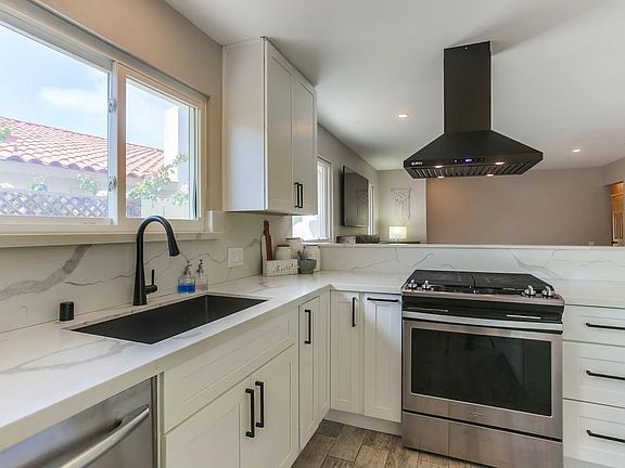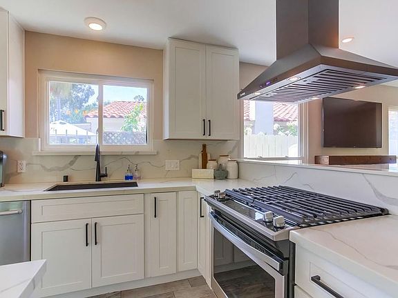 Highly sought after, remodeled, 3 bedroom / 2 bath twinhome with attached garage in South Carlsbad! Minutes from the beach & located in award winning Carlsbad Unified School District. This home has an open concept floorpan with wood like porcelain tile throughout main living areas. Living room has recessed lighting, wood burning fireplace with wood beam mantle and opens up to the kitchen making this ideal for entertaining. Kitchen features white shaker cabinets with matte black pulls, large pantry, Carrera Quarts Countertops continuing up the backsplash, large matte black Kohler single bowl under mount sink, all stainless steel appliances, matte black vent hood & eat-at island adorned with rustic chandelier. Dining room is very spacious with recessed lighting, ceiling fan light, bay windows & even a nook for a desk/office area. Master bedroom has sliders to private front patio, whole wall closet & ensuite with large floor to ceiling tiled shower & niche. Third bedroom has skylight and closet but no window. Second bathroom has shower/tub combo and skylight. Back patio is spacious and opens up to huge green belt/community grass area that lives like your own backyard. The best part is all landscaping is maintained by HOA! Alta Mira hosts numerous holiday events including summer concerts in the park with a live band. Community has two pools, two spas, two clubhouses, tons of walkways and mature landscaping throughout. Renter is responsible for all utilities (electric, trash, sewer & water) & cable. Renter maintains back patio and side yard. HOA maintains front yard and green belt. Owners pay HOA. Pets upon owner approval & require additional pet deposit.