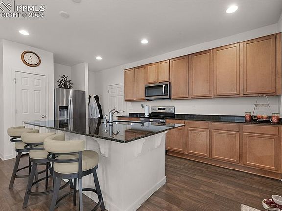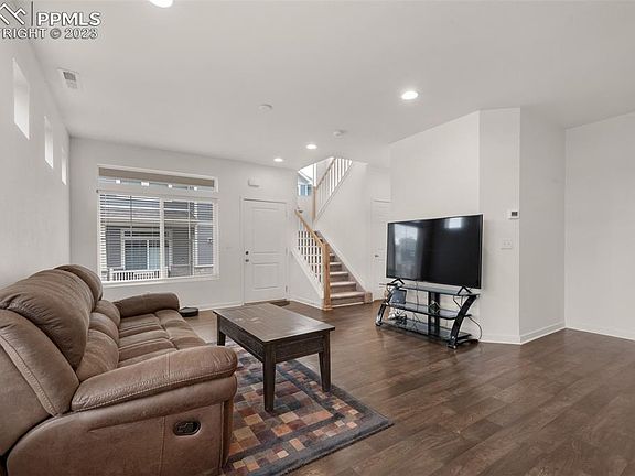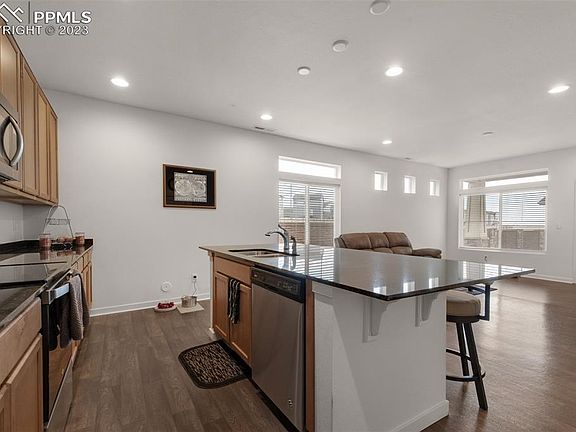 Incredible opportunity to own this like-new home in the desirable Banning Lewis Ranch community. A lovely covered front porch provides a warm welcome to a spacious open layout with modern updates waiting in side. Entertaining is easy in the open living room, dining room, and kitchen enhanced with new easy-maintenance vinyl plank floors, recessed lighting, high ceilings, and great natural sunlight. Home chefs will love the kitchen boasting sleek granite countertops, stainless steel appliances, an abundance of warm wood cabinetry and a large center eat-in island for more seating options. Door to the attached garage directly off the kitchen. Three generous-sized upstairs bedrooms, including the primary retreat with en-suite bath. Upper level versatile loft makes a great family TV room, and there’s a new sliding barn door to the laundry closet for easy laundry days. Attached 2- car garage with 220v, dry-walled, and bonus energy efficient electric vehicle charging station! Wonderful Banning Lewis Ranch amenities with access to the clubhouse, fitness center, wonderful pool, and a playground, and also includes the xeriscaped yard managed by the HOA. Conveniently located near military bases, shops, groceries, and restaurants, this must-see home is move-in-ready and just waiting for you to call it yours!