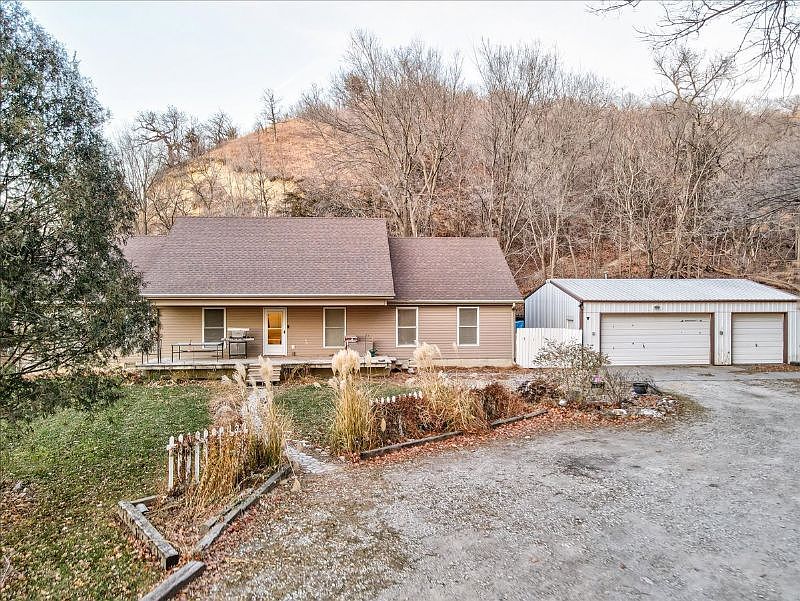 This home is tucked away in the Loess Hills of Mills County amongst 20 acres of timber, just South of Glenwood. There is over 2,300 sq ft of finish in this custom ranch. On the main floor, there are 3 bedrooms and 2 baths. The owners suite has a 5 piece bath, with shower, tub and double sinks. On the other side of the home, find a large family room that has access to an additional bedroom in the finished attic space. The kitchen area overlooks the living room and the private scenery surrounding the home. Outside there is a large 3 car detached garage which will double as a perfect workshop. Enjoy trails, firepits, private hunting and more on this property.