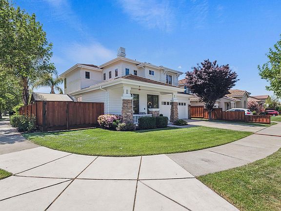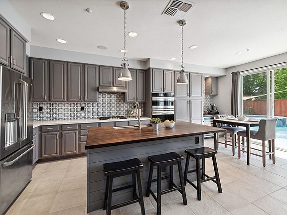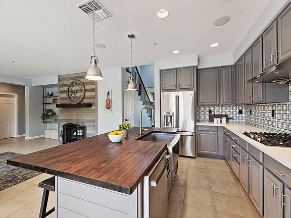 Must see this highly upgraded home located on PREMIUM CORNER LOT with NO HOA! Step through the NORTH facing double front doors to find a luxuriously upgraded interior that includes wrought iron banisters, wood accent wall, OWNED ELECTRIC SOLAR, two-toned paint, and plush neutral carpeting. The kitchen is a chef’s dream complete with a butcher block island with seating and pendant lights, stainless-steel appliances, gas range, farmhouse sink, slab counters, decorative tile backsplash and an added coffee/wine bar with built-in beverage fridge. Cozy up in the oversized family room by the shiplap-stained fireplace wall and accented by stylish wood shelving and an oversized modern ceiling fan. Functional floor plan with spacious BEDROOM & BATH DOWNSTAIRS. As you walk upstairs you can retreat to your luxurious primary suite with a walk-in closet and exquisitely remodeled bathroom. Enjoy the resort style backyard with lush tropical landscaping, in-ground POOL & SPA, large side yard with pergola, newer fencing and NO SIDE NEIGHBORS! Short walk to neighborhood park and schools.