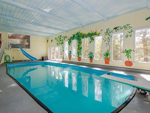 Mountain living meets cool contemporary architecture in this spectacular Evergreen Highlands residence. This is a fun one to see because it's not like the others - in the best way. Past the stone pillars you'll find this hidden gem privately tucked in on a gentle 2 acre lot with views. The open flexible living areas bathed in light are just perfect. Three wood burning fireplaces add ambiance, including your own fireplace in the upper level spectacular master suite retreat, complete with a private deck with continental divide views, kitchenette, and a luxurious 5 piece bath. The lower walk out level has a second kitchen and is ideal for recreation or possibly even for an in-law suite. Did we mention there's an indoor pool? Enjoy the photo tour and schedule your showing soon. You'll be glad you did.