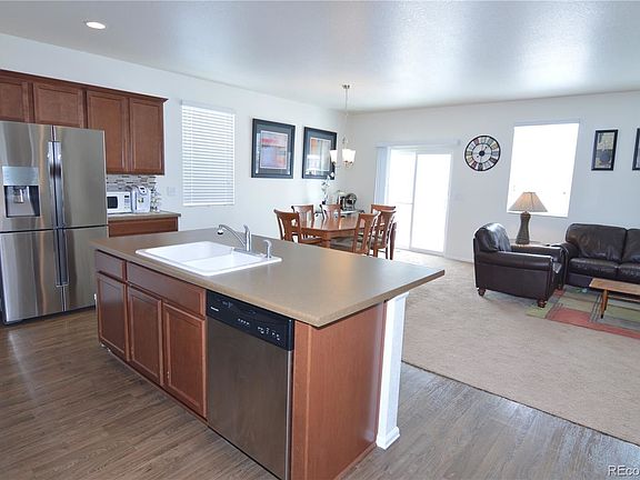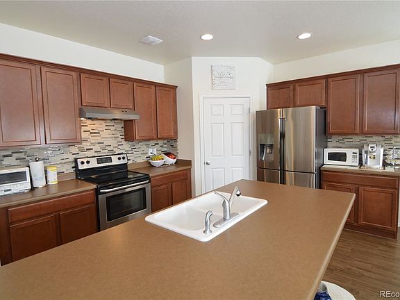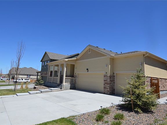 This spectacular ranch home, perfectly located on a west-facing lot features 3 bedrooms including a master suite with a huge walk-in closet, 2 full bathrooms and 1,655 total SqFt. This home features a lovely front covered porch, welcoming entrance, an open floor plan with a fantastic kitchen with dine-in island and large open floor plan family room. Enjoy the landscaped backyard with covered patio and additional large patio area. This home also provides an oversized three car garage with storage/shelving area and tall ceilings. New roof (2019), Neighborhood includes a community pool and miles of trails. Short distance to DIA, Shopping, Restaurants; Easy access to E470 and Pena Blvd