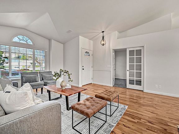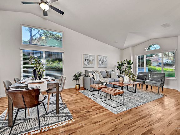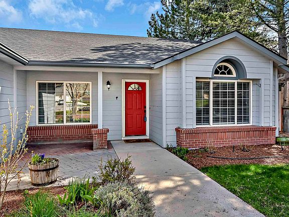 Enjoy the prime location & breathtaking views of the foothills in this incredible 3 bdrm & 2 bath home with office. Natural light floods the spacious floor plan with freshly painted walls and new carpeting throughout. The kitchen features updated appliances, formal dining, & entertaining space. The primary suite offers the feeling of a private retreat with unobstructed views, direct access to the outdoor patio, dual vanities, newly installed bathroom flooring, & a walk-in closet. Office has a closet & could be a 4th bdrm. Protected land sits directly behind you encouraging the enjoyment of your backyard oasis complete with a storage shed, raised garden beds, blackberries, raspberries, grapes, & fruit trees. Walking trails are accessible right from your backyard. Lucky Peak Reservoir is 20 minutes away, offering endless recreational opportunities. Additional features include a newer furnace, AC. H2O heater installed in 2023. Come for the convenient location & be amazed by the magnificent views & privacy.