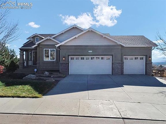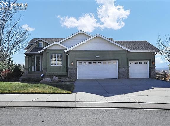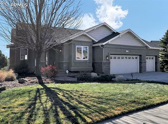 Stunning home featuring uncompromised attention to detail, ranch floor plan on a walk-out lot with sweeping views of USAFA & the Front Range. Gleaming hardwood floors draw you into the living room featuring stone fireplace, wall of windows w custom stained glass. The dining room & kitchen adjoin the living room making a perfect flow for entertaining. The gourmet kitchen provides gas stove w hood, double ovens, prep sink, ample counters and cabinets w pullouts/storage kits, upgraded appliances & pantry. Venetian plastered walls & custom window treatments enhance the elegance of this space. Master retreat offers a sitting area with stunning views, luxurious 5pc bath w steam shower & walk-in closet. Secondary bedroom is perfect for office or bedroom & is just steps from full bathroom. Laundry w utility sink lead to finished/insulated 3 car garage offering recessed lighting & prewire for workbench. The beautifully finished walk-out lower level features the sunny family room w oversized windows that provide sweeping views, wet bar, and adjoins the theater room. There are 2 large, versatile bedrooms in lower level, one has secondary mini split A/C system. Full bath with double vanity & private shower, and extensive storage room offering cedar lined closet, space for full sized refrigerator & beverage cooler and second set of washer/dryer complete the lower level. Enjoy summer evenings on the composite deck overlooking rose garden. No expense spared in this home w: heated driveway; custom window treatments; Hunter Douglas Blinds (south facing are motorized);crown molding; surround sound; high efficiency casement windows; Cat 5e data ports. Minutes from I-25 w easy access to Co Sgs, Denver, USAFA, District 38 Schools, shopping & dining. Come experience main level living, views & amazing amenities.