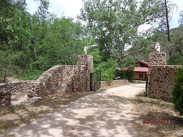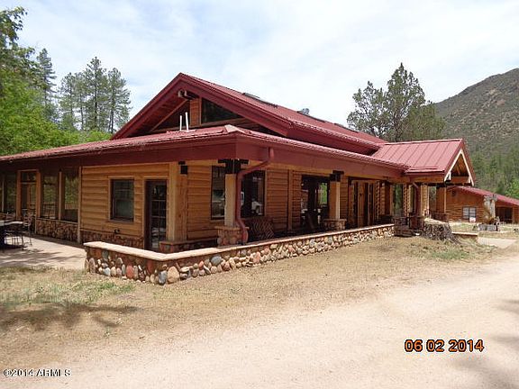 UNIQUE LODGE / MULTI HOUSING RETREAT COMPOUND IN THE MIDDLE OF THE TONTO NATIONAL FOREST! includes 2960 sq ft lodge built 1995 with maple flooring,custom hardwood cabinetry, tiled baths,massive double-sided fireplace, partial finished basement for private manager's quarters,attached screened-in porch & 1200 sq ft BBQ patio with built-in propane grill,rotisserie,smoker, etc.Also situated on 7.15 acres with Rose Creek running through it are 1450 sq ft 3 br 1 ba historic refurbished caretakers' home, detached 1 bdrm log cabin with loft, Bdrm/Bath count total for all lvg qtrs. 3324 sq ft METAL BARN/STABLE with 3 bdrms & 1/2 bath ground floor & 32' X 13' loft apt. Dual fuel storage tank; 50 KW Generac generator only 1,ooo hrs; SOLAR ELEC SYSTEM; PRIVATE WELL; wired for Internet & security