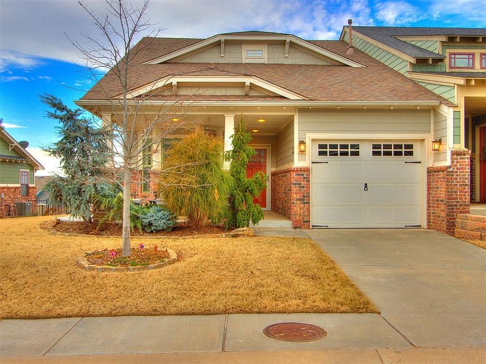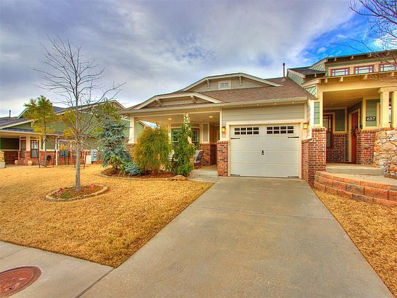 Welcome to 649 Outer Banks Way, a beautifully crafted end-unit bungalow nestled in a gated community in east Edmond, Oklahoma. This Nantucket floor plan townhome, built in 2016, offers 2 bedrooms and 2 bathrooms within 1,352 square feet of thoughtfully designed living space. Inside discover an open-concept layout featuring a spacious living room adorned with a vaulted ceiling and gorgeous wood beams, complemented by a cozy fireplace. The abundant windows, fitted with custom wood shutters, bathe the interior in natural light, enhancing the home's warm ambiance. The large, convenient kitchen boasts granite countertops and stainless-steel appliances, perfect for culinary enthusiasts. NEW HVAC 2024 (JULY). FRIDGE, WASHER + DRYER STAY. As a former builder's model home, this residence includes numerous upgrades, such as beautiful wood floors throughout the common areas. The property also features rain gutters and downspouts in both the front and back. Residents enjoy a low-maintenance lifestyle, with the Homeowners Association (HOA) providing exterior maintenance, lawn care, and upkeep of the gated entry, front and back yards, and sprinklers. $500 credit toward flower bed refresh in spring!Community amenities include a clubhouse for hosting events and a fitness center, enhancing the neighborhood's appeal. Conveniently located off 2nd Street and I-35, this home offers easy access to local shopping, dining, and entertainment options.
