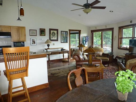 A delightful and unique Round deltec home on 10 stunning acres! Built in 2010, plentiful windows offer stellar distant views. Great room includes kitchen w/ granite breakfast bar, living/dining, opening to deck overlooking numerous gardens, fruit trees, berries. Two bedrooms, 2 full baths (room for 3rd in walkout lower level). Energy efficient construction and design with wood/propane furnace, on-demand hot water, cement fiber siding. Special.