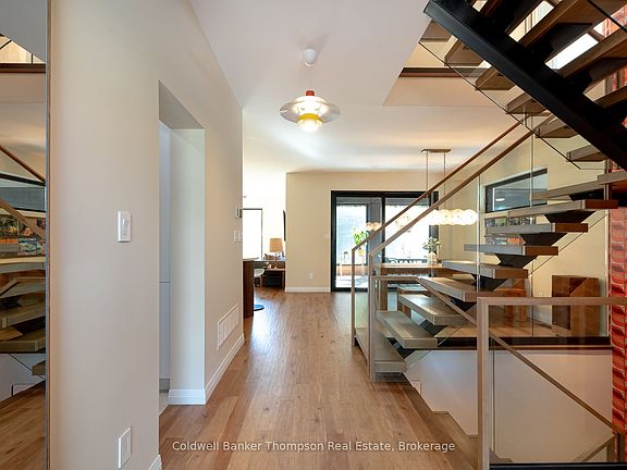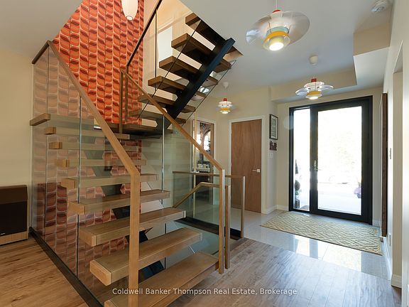 This stunning 2024-built modern residence sits on over 3 acres, offering the perfect balance of cleared space & natural woodland. Designed with architectural precision & mid-century sophistication, every detail reflects superior craftsmanship & intentional style. A spacious foyer opens into a bright open-concept living, dining & bespoke Polynesian-inspired kitchen. Anchoring each level is a striking staircase with block hardwood treads floating on custom-fabricated metal mono-stringers encased in plate-glass railings. Oversized sliding doors from the dining area extend the living space to a screened porch with propane hookups for a BBQ & fire table, seamlessly blending indoor & outdoor entertaining. The main floor also includes a stylish powder room, a mudroom with ample storage & inside access to the attached single-car garage. Upstairs, the primary suite is a sanctuary featuring a private sitting area, sliding doors to a south-facing balcony, walk-through closet & spa-like 5pc ensuite with double sinks, dual shower & heated floors. Two additional bedrooms share a 3pc bath, also with heated floors. The finished lower level is designed for relaxation, with a cozy rec room with projector & surround sound, a bedroom with built-in loft bed, a 4pc bath with heated floors & large laundry area. A true gem is the heated & cooled 30'x38' detached shop with 200-amp service, 13' ceilings, 11'x12' overhead doors & upper-level 2-bed apartment with private entrance. The apartment includes a modern kitchen, bright living area, deck, 4pc with heated floors & in-suite laundry, ideal for guests, family or rental income. Both the main residence & detached garage are built with ICF, ensuring exceptional energy efficiency & durability. Comfort is maintained year-round with high-efficiency heat pumps. Fully equipped with an EV charger & fibre-optic internet, every element of this property reflects meticulous attention to detail, superior craftsmanship & a refined modern aesthetic.