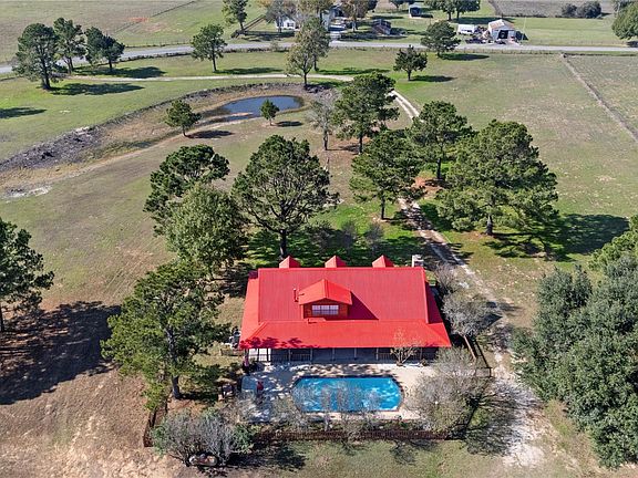 Rain Creek Ranch-82 Acres of Peaceful Country Living-Experience the beauty & privacy of this stunning 82-acre property with an electronic gated entrance, open pastures, wooded pockets and an abundance of wildlife. The 2,446 SF log cabin home offers 3 bedrooms, 3 baths, with 2 bedrooms on the main level. The living room features a wood-burning fireplace and opens to the kitchen, creating a warm space. Enjoy outdoor living with a beautiful pool and deck. The property holds a wildlife exemption and includes 3 ponds and has bird, owl and butterfly nesting houses throughout the property along with deer feeders. A large metal storage building, and 2 smaller barns are perfect for equipment and storage.