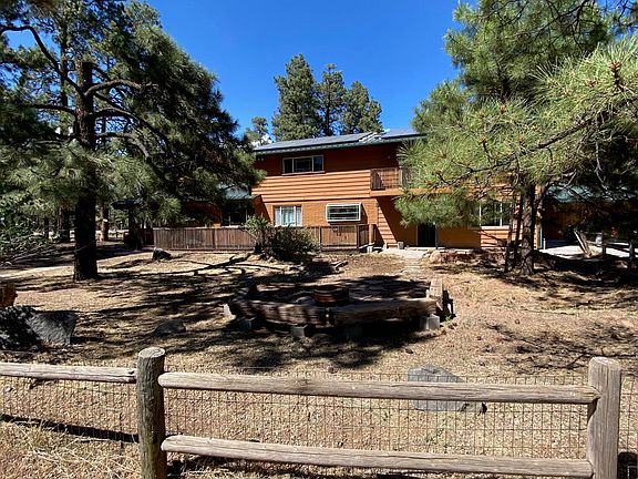 Now offered at a greatly reduced price! Plenty of space, trees and views await the new owner of this property that backs National Forest Service land. Ready for your horses, there are 4 corrals with plenty of space to roam and trees for shade. There is a detached 800 SF office. The home has 4 bedrooms (2 of which are large suites) and 3 bathrooms along with an office/mudroom off the garage. Open concept kitchen and Family Room - and for your grand parties, a HUGE Living Room with Malapai Rock fireplace and beautiful wood floors.