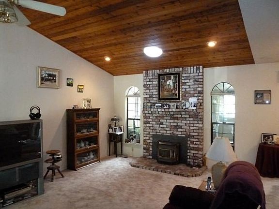 Great room design with wood vaulted ceilings and a brick fireplace with insert in this custom built 3 bedroom home. The kitchen is nestled between the formal dining area and has a breakfast bar to serve the sunny breakfast nook with bay window. There is an enclosed sunroom (not included in the square footage) and a covered deck overlooking the backyard with low maintenance landscaping and flowering shrubs. The master bedroom suite has a walk in closet and private bathroom. The two guest bedrooms are near the hall bath for convenience. There is a circle driveway in the front of the home plus lots of parking for an RV on the side of the home. You can put all of your treasures in the two storage buildings, one used as a shop by the owner. The home is tucked back on the lot for privacy and on a cul-de-sac so no through traffic. Brokered And Advertised By: Real Estate Professionals Listing Agent: Sue Soeth