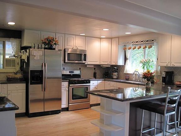 Ganite countertops and stainless steel appliances in kitchen, granite countertops and glass shower and jacuzzi tub in main bathroom, hardwood throughout, 2 car garage, one level, covered back porch, 3 blocks from bike path and three blocks from I-70. Large back yard and doggie door. Water, mowing and lawn chemicals included. Renter pays for power and trash. month to month after lease expires.