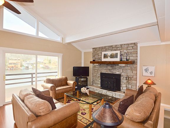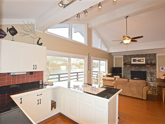Awesome lot w/spectacular views. Wide deep cove w/main body views. Level lot with easy access to home & water's edge. Beautifully updated throughout. Empty lot next door for added privacy. Wide open floor plan. Kitchen with granite counters, vaulted ceiling, breakfast bar, new Jenn Air and convection oven. Great Room w/ Brown County stone fireplace insert which can be changed to regular fireplace. New Pergo flooring. Floor to ceiling A Frame windows on entire front of home for beautiful views. Master Bedroom, Bedroom Two upper level. Full Bath upper level with new tile in shower, new flooring, new cabinet with sink. Family Room main level with tile flooring, ceiling 8', slider out to covered lower Deck. Extra sleeping area in lower level for guests. Unbelievable outdoor areas. Large deck upper level, side Deck, covered Deck lower level w/ large bar with seating, Party Deck, large Dock w/diving board, beach area, stairs into large wading area. Exterior blinds on all lakeside windows. HVAC two years old. This is a fantastic property!