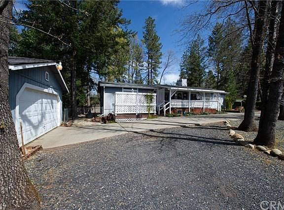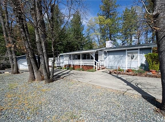 Resting among the pines of lower Magalia on a corner lot, sits this charming manufactured home. Featuring 2 bedrooms, 2 bathrooms with a den, and detached 2 car garage. Upon entry you are welcomed into the carpeted living room with newer wood burning stove, vaulted ceilings, and dining area. Off the entry is the large double door office/den, guest bedroom and bathroom. The guest bath offers a tub/shower combo, and granite transformation counters. The kitchen has white cabinets with newer white appliances, and large walk in pantry. The spacious master has ample closet storage, and spacious en-suite bathroom. There is a circle driveway with a detached 2 car garage, and fully fenced yard with mature land scaping.
