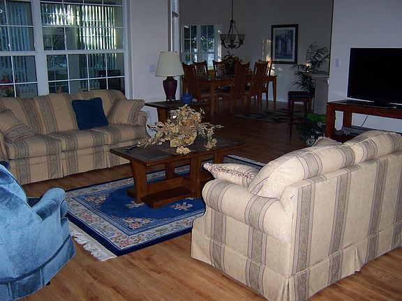 Expanded, updated custom Monaco. Features two master suites, with 4 walk-in closets (2 each). Large front porch and enclosed wrap-around lanai under heat and air. Kitchen has brand new stainless (smudgeproof) appliances including a wine cooler. Updated comfort height in half-bath off kitchen. Indoor laundry leading out to oversized 2 car garage. Newly improved with laminate flooring throughout. Tile in kitchen and baths. AC replaced in 2012. REDUCED 10K!!!
