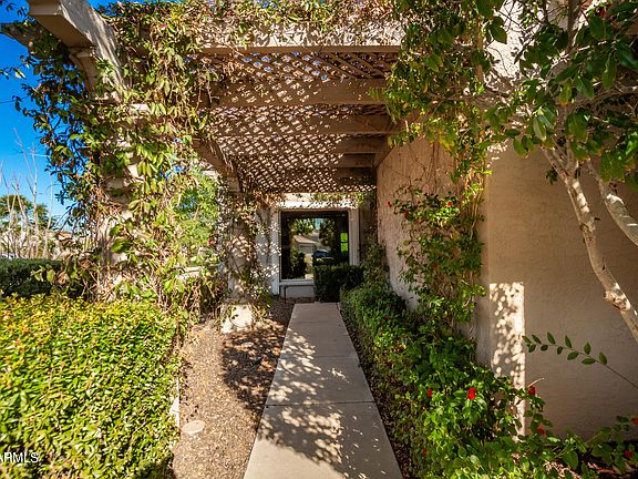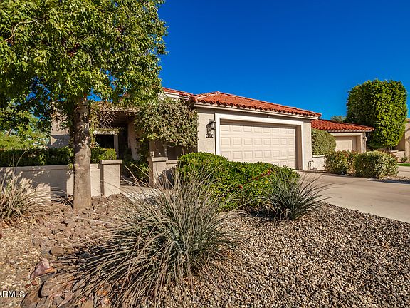 LOCATION LOCATION!! Updated Scottsdale home set on a coveted corner lot. The living room boasts high ceilings with exposed beams and a versatile den that could also be a 3rd bedroom. With newer paint, flooring, kitchen and baths, this home is move in ready. A two-way fireplace perfect for family or entertaining. Beautiful gray cabinets, quartz counters, and stainless steel appliances. The main bedroom features sliding doors leading to the backyard, a walk-in closet, and an updated private bathroom with dual sinks. Outside, the backyard showcases a covered patio, a built-in BBQ, privacy trees around the perimeter, and a putting green! AC, water heater and roof coating were recently replaced! Fridge included! Access to trails and partial view of the golf course make it an ideal home