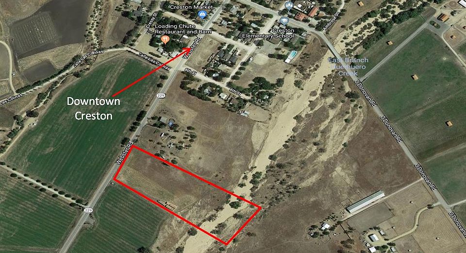 Country living in Downtown Creston. 10 acres of Class 1 farmland and homesite area with scenic Huero Huero River and woodland area. Includes 6 +/- acres of Class 1 prime farmland. 100+ GPM well. Currently in forage hay production. Can build two homes, shop and barn. Walk to the Downtown or out to dinner at Loading Chute in 5 minutes. Prime water, land and location. Build your dream Farmhouse.
