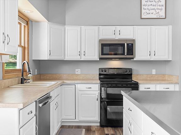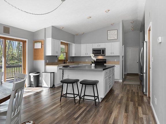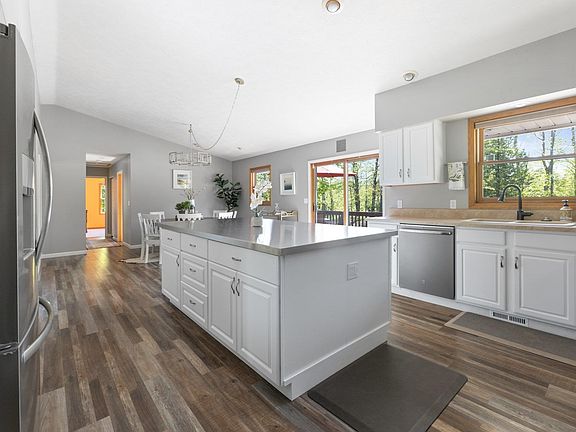 This spacious, beautifully updated 5 bed/3.5 bath ranch home is nestled upon 2.2 wooded acres on TC's coveted West side! The main level of this home features an inviting living room with Luxury Vinyl Plank flooring, vaulted ceilings, and a stunning natural stone fireplace that opens to the kitchen and dining area, allowing numerous opportunities for easy conversation and entertaining. The kitchen features crisp, freshly painted cabinetry with ample storage, a new stainless-top island, all new appliances, and a dining area that opens up to the deck, ideal for grilling or dining in the open air. Just down the hall are 2 guest bedrooms, a laundry room, and a half bath. Finally, a sizable Primary bedroom boasting a walk-in closet and en suite bath with a relaxing jetted tub, rounds out the main floor. The lower level makes hosting guests a breeze with 2 additional bedrooms, a full bathroom, and the perfect home office space. This fully finished lower level walkout also boasts a large family room with a new gas fireplace, and a bar area that includes a sink, mini-fridge and microwave. The outdoor area features a tranquil mix of sun and shade, recently updated and landscaped to open up and level the yard, while maintaining privacy. At the base of the property you'll find an abundance of fruit trees, creating a bird watcher's paradise. A 2-car attached garage with workshop area, a separate pole barn, and a shed with a carport offer lots of storage space for housing any accoutrements needed for living your Up North life to the fullest! With a location that's less than a mile from award-winning Moomer's Homemade Ice Cream and just over 5 miles from downtown Traverse City and all its amenities, the only thing missing is YOU!