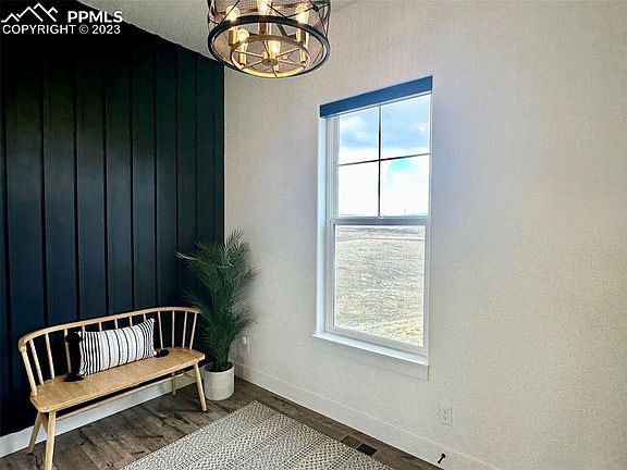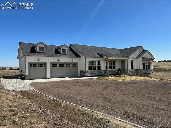 Come see this beautiful 4,724 sq. ft. 5-bedroom 3-bathroom well-appointed ranch style home. Built in 2021, with an oversized 3-car garage, on a walk-out basement on 5 acres in the High Plains Filing No. 1 subdivision. This one will not disappoint and is full of custom features and upgrades. This home is at the end of a paved cul-de-sac and features a long private driveway. 10-foot ceilings throughout the approximately 2400 sq. ft. main level makes the home feel spacious and inviting. The floor plan features open concept living at its finest. There is a large kitchen island with quartz countertops, a spacious adjoining pantry, and plenty of seating available to entertain family and friends. Includes double ovens with smart technology, hand crafted masonry fireplace, heated tile in the owner's suite bathroom, and main level views of Pikes Peak which will leave guests stunned and impressed. In the walk-out basement, you'll find 9-foot ceilings throughout, a custom home theater room that rivals the major theater chains, as well as a giant recreation room that is full of possibilities. Two huge bedrooms are in the basement along with a large unfinished mechanical room that is perfect for storage. Views from the home are breathtaking and the home offers both convenience and privacy. Easy commute to either Colorado Springs or Denver. Fiber optic internet is available at an affordable price through Century Link (1GB per second), which makes working remotely a breeze. Located 15 minutes from shopping in Northgate, Interquest, Monument, and Powers. Flying Horse North is practically across the street. Located in one of Colorado Springs' best school districts (D-38). No HOA (or fees). Why go through the lengthy and stressful build process when you've got a beautiful home built in 2021 in a great community that's ready now?