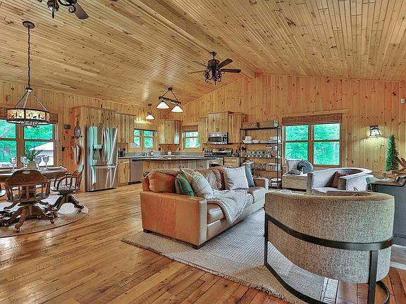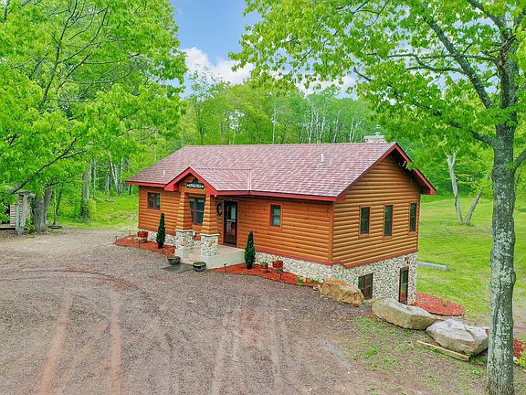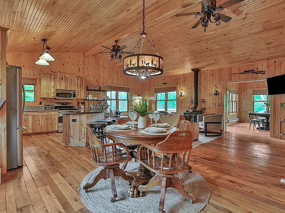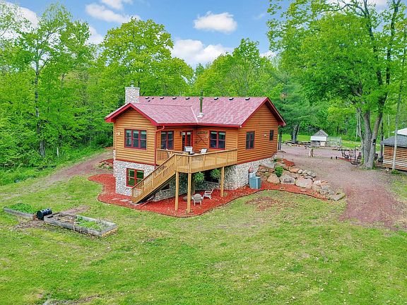 Welcome to your dream retreat! On 400 wooded acres of high ground, this property is a sportsman’s paradise. Enjoy the serene private lake shore and explore miles of groomed 4-wheeler trails. For the avid hunter, there are 6 fully enclosed hunting stands, and the land abounds with bear, turkey, deer, grouse, and duck. The property also features dozens of apple trees, raspberries, blueberries, and maple trees for tapping syrup. The rustic cabin-style home boasts log siding, vaulted ceilings, and tongue and groove walls, creating a warm, inviting atmosphere. With 4 bedrooms, 3 baths, and panoramic views from the 4-season porch, this home offers comfort and tranquility. Cozy up to wood-burning fireplaces in both the living room and family room. Additional amenities include 2 pole barns (30x50 & 30x60) with concrete floors, electricity, radiant heating, and finished interiors—ideal for storing all your toys and equipment or an additional entertaining space. This is the ultimate package!
