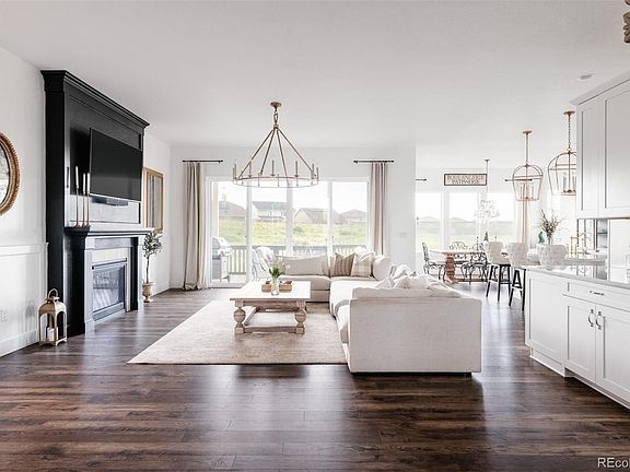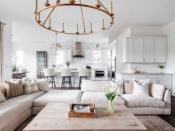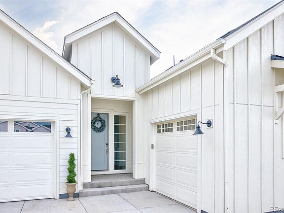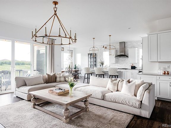 Ranch living in an exquisite Castle Pines home with a farmhouse elevation, backed to open space. Live in a newer home with all the custom upgrades and designer finishes already added. From high-end flooring to elegant fixtures, wood trim accents, marble backsplash and mont blanc quartzite counters. The spacious, open floor plan & 10 foot ceilings allows for a seamless flow. Natural light floods the space. The main floor has two bedrooms with two en suite baths. Two beautiful upgraded tile walk in showers. A large study & mudroom with custom built-ins. The living room has a statement chandelier & modern black fireplace. The stunning kitchen features a 9 ft mont blanc quartzite island, gourmet appliances, white shaker cabinetry, striking gold pendant & sconce lights & white carrera marble backsplash to the ceiling. The dining space is just off the kitchen and overlooks the greenspace. All of the windows are shaded with custom Restoration Hardware drapery. The large elegant master bedroom overlooks the private backyard and connects to the primary bathroom. Dual vanities, a built-in makeup counter, upgraded tile in the large walk-in shower with dual showerheads. The spacious walk-in closet connects you to the laundry room, which showcases black and tan checkered tile. The walk out finished basement houses 2 bedrooms, a full bath, a living room with a beautifully designed dry bar, black shiplap, beverage fridge, & quartzite counters. The most unique feature of all is the hidden speak easy you’ll discover behind the armoire doors.Step outside onto the landscaped yard with four 15 ft pine trees. A 2-tiered deck and large brick patio where you'll find the perfect oasis. Throughout the year, large elk herds and deer gather in this open space, creating a truly remarkable sight paired with breathtaking sunrises. Castle Pines offers the beauty of nature & the convenience of amenities.