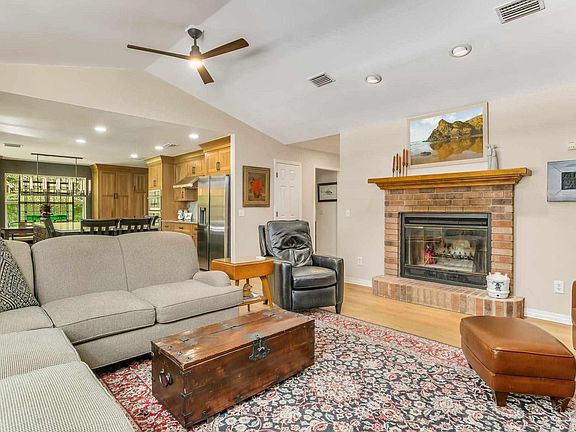 Well maintained and tastefully updated 3 bedroom 2 bath home situated on 4 acres! This brick home offers privacy with a large lot that is covered in mature landscaping that provides ample wildlife and space for outdoor activities. Inside, the home offers luxurious wood look flooring. The front den offers additional living or entertaining space. Making your way into the main living space provides vaulted ceilings, fireplace with brick hearth, modern lighting fixtures, and surround sound. The completely remodeled kitchen includes real wood cabinets, induction cooktop with stainless steel appliance package, double oven, recessed lighting, granite counter tops and spacious island with additional storage. The kitchen provides a multitude of seating options including breakfast bar and designated dining space. The home offers an office space or separate bedroom with 2 closets, and additional guest bedrooms. The spacious primary suite offers views of the expansive backyard, walk-in closet, fully tiled shower with glass surround and double vanity. Out back, the home offers a spacious open patio with retractable awning to provide great shade. The inground jacuzzi style pool offers relaxation. The backyard provides a well for the irrigation, a large oversized 2-car garage with workshop along with a completely enclosed RV garage with power and a junction box that could support 30amp. Additional features include full solar system with battery power backup installed in 2022, full home gutters, roof in 2019, HVAC in 2014 and so much more!