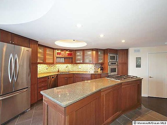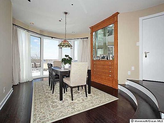 Private waterfront community overlooking Navesink River for the sophisticated buyer. One of the biggest & best at The Bluffs over 2600 sq.ft. of refreshed living space w/3 spacious levels,designed w/waterviews from every room. 10 ft. ceilings in LR w/HW flrs. new gourmet kit. w/granite ctp. & SS appl, interior elevator & 2 car gar. Exterior feat. 2nd fl.wrap-around deck & covered lower level patio. Community pool, dock & boat slip included. Short walk to all things downtown & NYC transit.