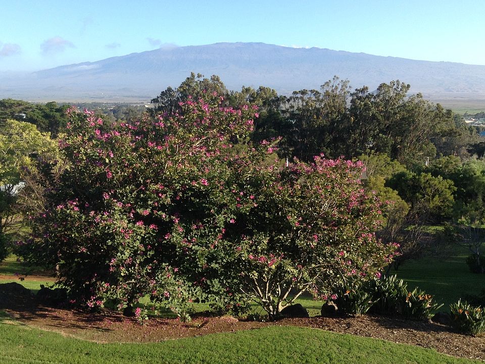 Panoramic views of Mauna Kea, Mauna Loa and Hualalai Mountains from the Kitchen, living room, family room, master bedroom and shower . Upstairs has 2 bedrooms with sitting room and lanai. All area have an unobstructed view of the mountains and extensive gardens.