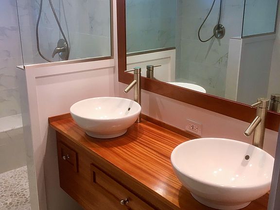 Located in the most desirable area for weather and neighborhood, this beautiful 3 bedroom, 2 bath home features custom mahogany wood doors,floors and cabinetry. Upstairs has a beautiful separate large room that can be used as a guest bed or office, with custom woodwork throughout. The kitchen has cabinets with a combination of Honduran mahogany and burly African mahogany(bar tops are the same), counter tops cut from two slabs of imperial gold granite creating a seamless look. This connects to the living area with a wood burning fireplace and off to the right a spectacular custom skylight. One full bathroom and mini pantry also upstairs. Downstairs a modern 2 shower head and double sink master bathroom with African mahogany counter and drawers. Two bedrooms, one with wood floor and the other carpeted, with a central den/TV room.There are Custom doors throughout the home and the front door of this home is a replica of the same doors made at a custom home at the Mauna Lani, and is featured on the local art showcase pages of the January 2017, West Hawaii Today newspaper. Real Santos mahogany wood floors throughout and two car garage. The home also features 3 lanais . Kitchen window and upstairs bathroom looks toward Mauna Kea Views.Home is on a 10,000sqft lot that backs up to a beautiful undeveloped four acre parcel.This home is at the end of a quiet cul-de-sac with beautiful walks to nearby streams and waterfalls.It is walking distance to private and public schools in the area. There are many restaurant, shops, and cafes to enjoy as well around the corner. It is a charming beautiful place to quietly reside while you are still in the close range of town. The weather is always cool and sunny, with an afternoon mist.