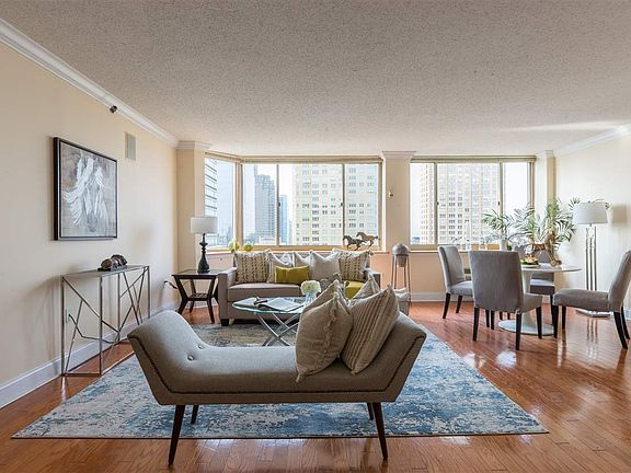Situated in the luxurious Portofino building along the Jersey City waterfront, this 1,327 SQFT home is the largest two bedroom in this complex. It offers on-site parking, updated finishes, paramount views, and excellent transportation options. Let's start inside this sun filled, South-East-facing, contemporary home. A doorman greets you upon making your way up to this space and once you enter, you'll find luminous hardwood floors, oversized windows and an expansive floorplan. This particular unit is the largest of its kind in the building. Offering over 1,300 SQFT, this home features a two-bedroom layout and the added benefit of an extra room with the possibility of converting into a den or a third bedroom. The kitchen offers a suite of stainless steel appliances, including a refrigerator, dishwasher, magnificent custom cabinetry and a pass-through window to easily serve your guests. The master bedroom has yet another oversized window letting you soak in the river views and start your day off right. Air conditioning and an in-unit washer/dryer complete the space. The building itself is chock full of desirable amenities including a pool, community room, on-site gym and doorman. If you can drag yourself away from your home, enjoy the benefit of your fabulous location. You'll find access to the PATH and HBLR just outside your home, fine dining options and nightlife venues throughout downtown and convenient shopping options like the Newport Mall and more.