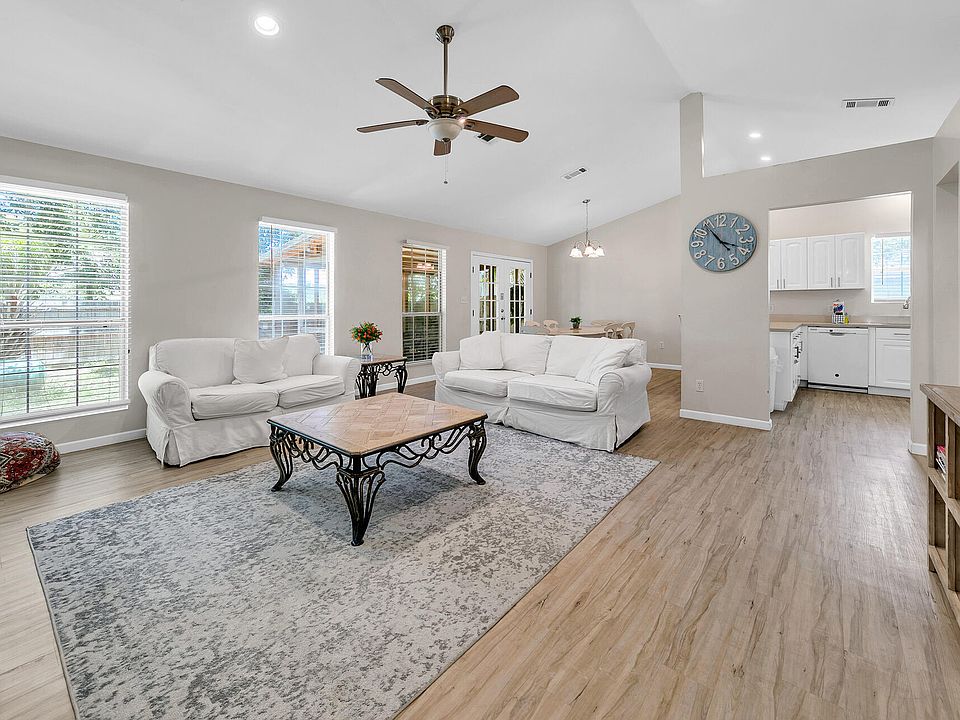 Tranquil, one level Blue Mountain Beach retreat located 1/2 mile or less from everything you need or want - public beach access, the 30A bike path, delicious local dining, area shopping, and the Longleaf Greenway Trailhead through the Point Washington State Forest! This 3BR/2BA home with two-car garage has been beautifully updated with a new HVAC (2024), granite countertops and new solid surface flooring throughout. Vaulted ceilings add an airy atmosphere to the bright and open living spaces while a screened porch overlooking the fenced backyard is a sweet spot to relax after a day in the sun. The master suite features an ensuite bathroom while two comfortably sized guest rooms share a hall bathroom. This property is within walking distance to the beach and has plenty of parking with an updated paver driveway and brand new HVAC.
