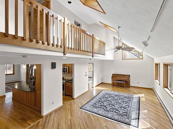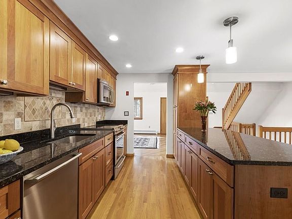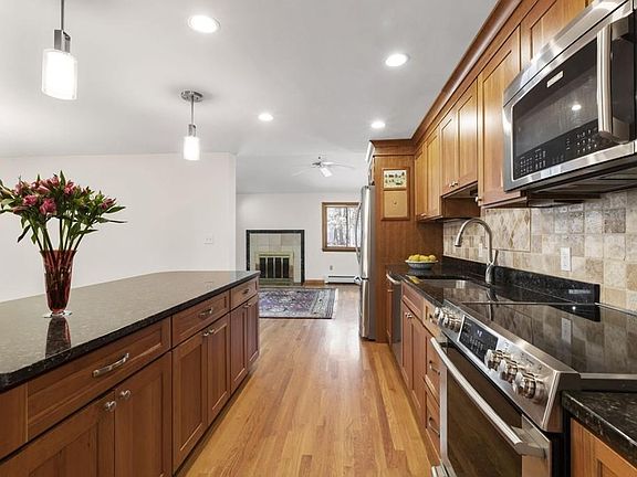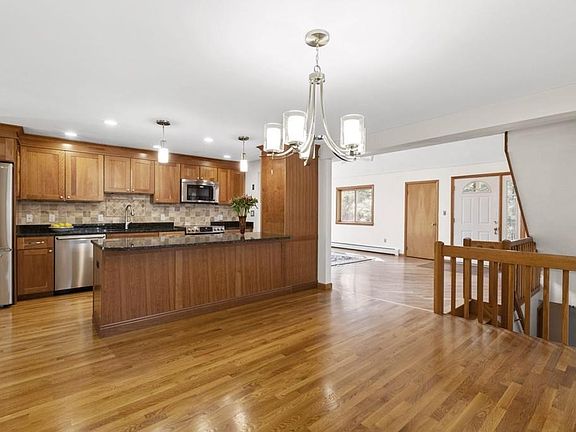 Move right in to this bright and airy contemporary set in pretty Holliston neighborhood.First floor boasts updated kitchen with stainless steel appliances, gorgeous cabinetry and granite counters. A large living room with skylights, open to 2nd floor.Vaulted, spacious family room with fireplace and sliding doors leading to deck.The first floor bedroom, next to a full bath, is perfect for in-law or one story living.Two good sized bedrooms on 2nd floor with updated full bath.Master bedroom with Juliette balcony overlooking private wooded back yard.Gleaming hardwoods throughout main part of home and every room has been freshly painted.Additional living space in basement that can be used as home office or playroom with mud area leading to 2 car garage. Newer high efficiency furnace.This home is on the Hopkinton line so, great location for commuting from Ashland MBTA or access to highways.