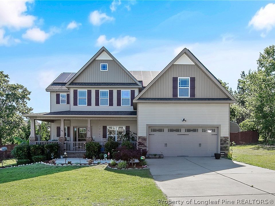 This beautiful home includes 4 Bdrms. Bonus/Rec Room sitting on almost 1/2 an Acre! Topping it off with a value of $40,000 in Solar Panels (fully paid for). Stone veneer accents on the front elevation and Lg Front Porch. Walk into the 2-story Foyer and Beautiful Laminate Flrs throughout, Formal Dining Rm with Wainscoting & Trey ceiling, Gourmet Kitchen w/Granite, a tile back splash, an Island, & Lg Pantry, Breakfast nook & the cutest Keeping Rm leading out to the Screened in Porch. The 1st floor Bedroom w/connecting Full bath could be considered your "In-law Suite". The Master Suite upstairs includes a Lg Sitting Rm & gorgeous Trey Ceiling, Bathroom with a huge corner Double Vanity & WI-Closet to die for. Two add'l Bdrms & a Lg finished Bonus/Recreation Rm with a Closet, plus a Full Bath w/Dual Vanity. Escape outdoors to your own oasis to include an Above Ground Pool, Deck, Pergola & Bar area for those Summer Entertainment Vibes! Plus a "HE" >or< "SHE" Shed! * Welcome Home*