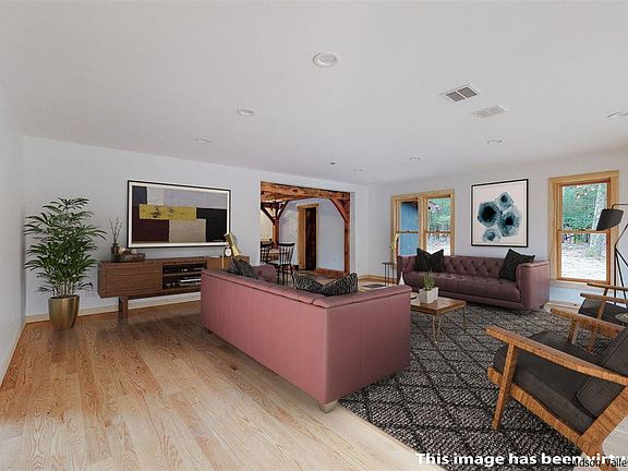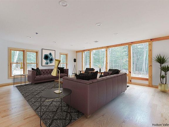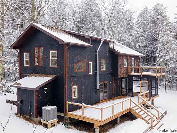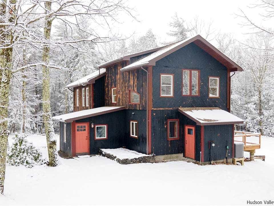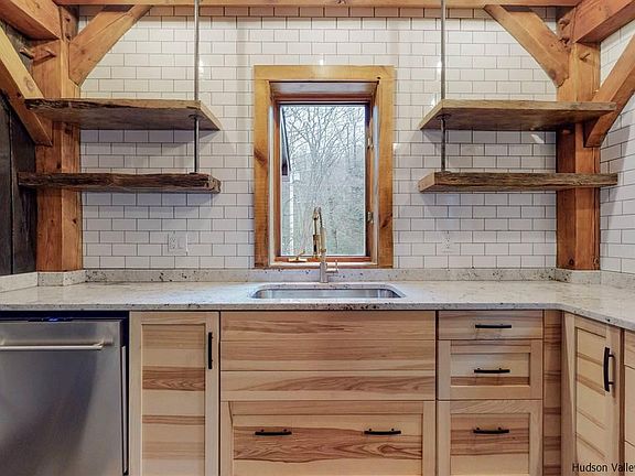 This arts and crafts style mountain home blends rustic elements with contemporary elegance and has been renovated to the highest standards. The exterior features Shou Sugi Ban, originating in 18th century Japan, a method of preserving wood by charring it with fire. Over-sized windows are thoughtfully placed throughout the home to highlight the natural surroundings and mountain view. The lower level has an open floor plan concept and features radiant heat, wood burning stove, hardwood floors, screened-in porch and large deck perfect for entertaining. The ceilings highlight the stunning post-and-beam construction featuring solid timbers and wooden pegs. On the other side of the main living room, the open kitchen area works equally well for entertaining and dining. When the gathering is less formal, guests can settle down in the rustic-meets-chic covered porch area to take in the mountain views. If the culinary arts is part of the equation for you, then this satisfyingly thick granite countertop with a luminous glow pairs with the hickory custom cabinets to balance the style scale and elevate the kitchen. Fun and frivolity also can spill over to another cozy hangout area as you make your way upstairs, the open-loft space. If remote work is priority, this area can double as an office space. All bedrooms are located on the second level and are neutral, though: What would dare compete with these mountain views? Answer: The master bedroom suite. It features a private balcony where you can watch the sunset over the mountain. If relaxation is what you need, the master suite also features a luxurious rain shower and cedar sauna. This retreat looks to its surroundings for materials; using local stone and timbers help ground the home in its context. This home is owned and designed by local carpenter, Daniel Nichols. His company, Nichols & Nichols Construction was responsible for the renovation of the award-winning Urban Cowboy Lodge located in Big Indian, NY. The Urban Cowboy Lodge was recently voted #1 Best New Hotels in the World by National Geographic due to its jaw-dropping design and aesthetic.