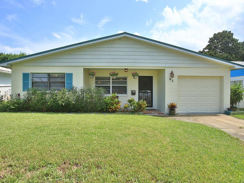 NICELY UPDATED BEACHSIDE BUNGALOW. 2 BEDROOMS, PLUS 3rd small room for office or nursery, 2 FULL BATHS & 1 CAR GARAGE. Concrete block home with metal roof, new HVAC system (2014), new irrigation and pump (2012), electric updated (2008), newer 13ft x 12ft deck in fenced back yard with 9ft x 11ft utility shed. Welcoming front entry porch leads into the living room open to dining and kitchen and looks through back family room to the natural light from newer glass sliding doors to rear deck and backyard. The floor plan is well laid out with wood laminate flooring in main living area. Master bedroom has modern bath with tiled, walk-in shower and customized walk in closet! The kitchen has newer cabinets, tile backsplash & large pantry. Two oceanfront parks are just down the street!