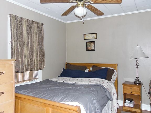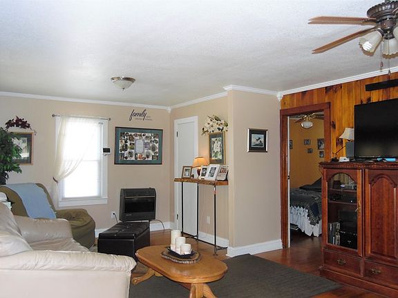 Improvements since seller purchased. Replacement windows, metal roof, kitchen cabinets, (2007-7'6 x 24 room addition to expand dining area and a laundry area), back covered porch - 8x23, paint, some new ceilings Features: Mini split HVAC system installed in 2022. Large open living room with stone hearth and wood stove, hardwood floors, heartpine tongue and groove walls, 2 bay large concrete buildings used as garage and wood shed, outbuilding, 2 city lots with nice large level backyard. Convenient to downtown historic Marion. City water & sewer. Average utility $65-$100 per month.