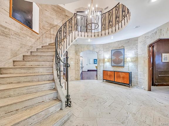 Sculpted regal fireplaceHome officeSweeping wrought-iron staircaseIntricate plasterworkCircular limestone foyerOversized formal dining roomWide-plank hardwood floors