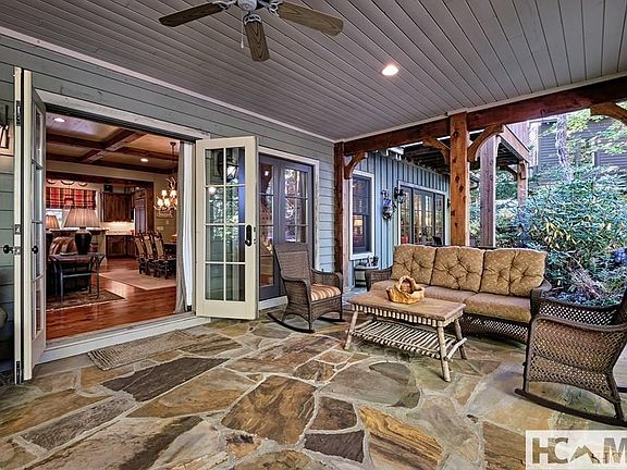 Inside, the home welcomes with warm Australian Cypress wood floors, a dramatic stacked-stone masonry fireplace, wood-paneled walls, and coffered, wood-beamed ceilings. The open-concept layout is designed for gatherings, with French doors that extend the living room onto a spacious flagstone patio—perfect for entertaining or relaxing in the cool mountain air.