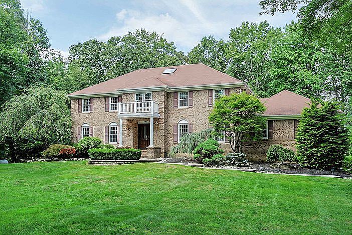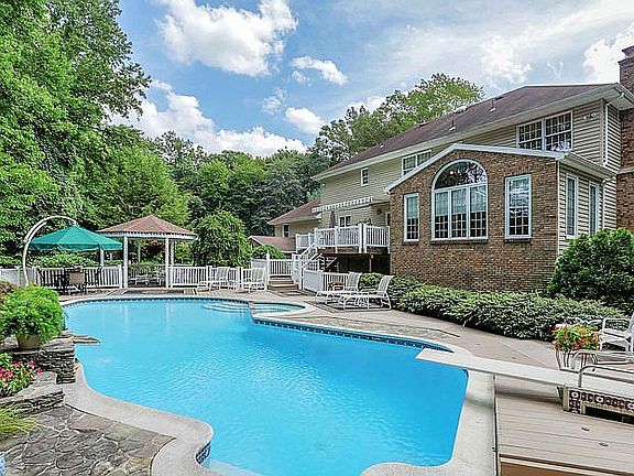 Secluded elegance! Treat yourself to great times at this Morganville home with heated in-ground gunite pool with three tier stone fountain. Along with pool house, gazebo, tennis court, multi-level deck, and motorized awning. This well-maintained 2-story 5-bedroom, 3 bath home in Morganville with traditional floor plan delivers a grand dining room, elegant living room, and expansive great room with wood burning fireplace. Eat-in kitchen with newer appliances & center island. Master suite with separate shower, dual sinks and walk-in California style closets for your wardrobe. Residents of this neighborhood enjoy convenience of NJ Transit bus service to Port Authority and Midtown Manhattan and Marlboro Township Public Schools as well as traversing the county on the nearby Henry Hudson trail. 2 New Gas furnaces and water heater recently installed. Appliances are all new. All shrubbury on property are large specimen trees. Pool has been recently been resurfaced and the heater is only two years old. Hardwood floors throughout except carpet in one small area of second den. 4th garage in back for storage.