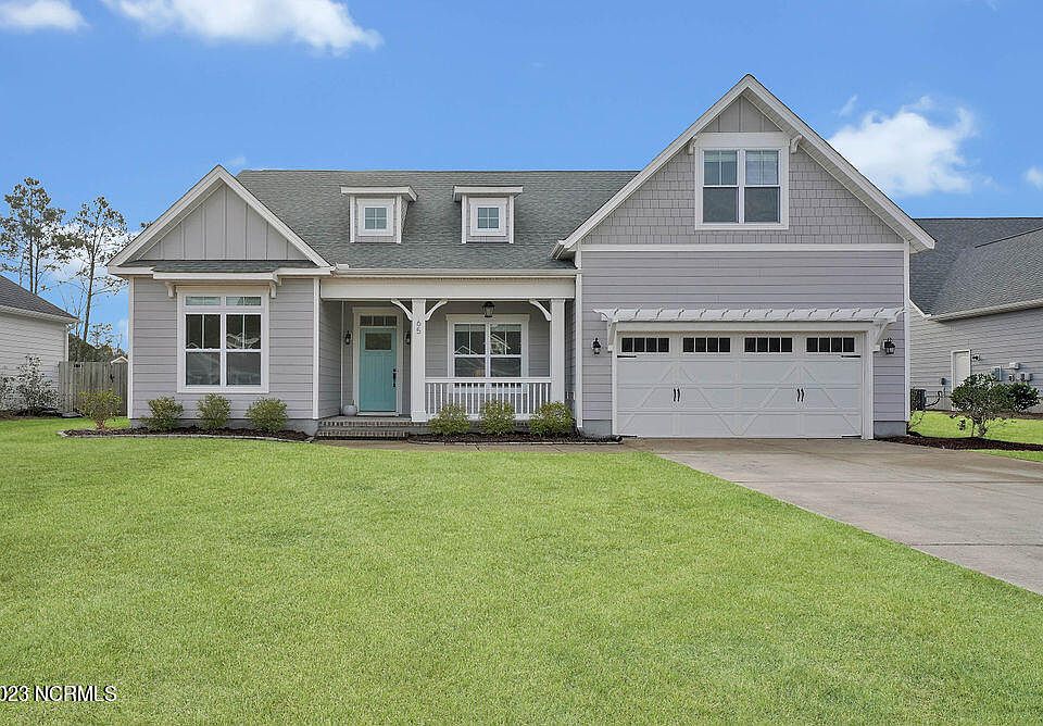 Welcome to your new home, tucked within the placid neighborhood of Canter Crest, a quiet 39 home community in the heart of Hampstead. This Bill Clark built home is the Helmsley floor plan, which features 4 bedrooms, 3 full baths, a large flex space and a yard tailored for the leisure lover. This property greets guests with a friendly rocking chair front porch and coastal cottage styling. The front door opens onto richly colored LVP flooring that runs throughout the primary living area and blends beautifully with visually appealing judges panels. The main floor boasts a dining room, open floor plan, great room with 11' ceilings, gas fireplace, three bedrooms including a first floor primary owner's bedroom suite, custom built-in shelving, a custom window seat, and more. Serve dishes made from your own fruit trees and garden beds, in a thoroughly modern kitchen outfitted with stunning quartz countertops, breakfast bar, and tile backsplash. The real showstopper here is the incredible backyard living space. Imagine morning coffee on the screened porch, afternoon hammock naps beneath the custom built pergola, and evenings spent with friends gathered around the hardscaped fire pit area. All this plus a two-car garage, additional upstairs living space, an upstairs guest room, full bathroom, and walk in attic storage, this home is your best next move. Request your private tour today and get ready to start making memories to last a lifetime!